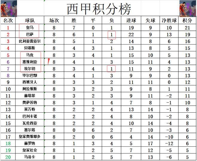 北京时间10月6日凌晨,2025-26赛季西甲联赛第8轮结束最后5场比赛的争夺。经过一番鏖战,阿拉维斯主场3:1击败埃尔切,巴萨客场1:4不敌塞维利亚,西班牙人主场1:2负于皇家贝蒂斯,巴列卡诺客场1:0小胜皇家社会,塞尔塔主场1:1战平马竞。皇马昨天先赛击败强敌比利亚雷亚尔及时止住颓势暂时夺回了榜首,巴萨今天作客皮斯胡安球场,必须得拿下塞维利亚才能再次超过皇马登顶。开场后塞维利亚就给巴萨很强的阻力,仅仅9分钟,塞维利亚前场左侧边线球机会,巴尔加斯大力往门前掷过去,罗梅罗小禁区处倚住阿劳霍凌空将球卸下,随后罗梅罗转身突破,阿劳霍在已经卡住角度的情况下多余伸出脚将罗梅罗绊倒,主裁亲自观看VAR后吹罚了点球。曼联旧将桑切斯操刀主罚一蹴而就,塞维利亚1:0取得梦幻开局。早早进球的塞维利亚气势大涨,随后攻势很猛,罗梅罗获得2次绝佳机会,但是他都没有把握住,超级距离推射都打偏。第36分钟,孔德中场接球失误,被苏亚索硬生生将球断走,塞维利亚发动快速反击,巴尔加斯高速插上接球杀入禁区左侧精准横传中路做饼,右侧跟进的罗梅罗这次终于把握住机会,小禁区前沿超近距离单打轻松推射得手,塞维利亚2:0领先。上半时补时6分钟,第51分钟30秒,另一个曼联旧将也进球了,巴萨右路压上,佩德里45度角精准过顶斜吊,禁区左侧无人防守的拉什福德后排插上小禁区前沿抢点直接左脚凌空推射得手,这是拉什福德打入的首粒西甲进球,巴萨半场结束前1:2扳回一球。易边再战巴萨加强进攻,第72分钟,巴萨左路压上,替补登场的巴尔德和拉什福德做个撞墙配合,拉什福德禁区前沿策应直塞,巴尔德插上接球强行突破杀入禁区,刚刚替补登场不到1分钟的贾努扎伊将巴尔德放倒,主裁再次吹罚了点球。莱万操刀主罚竟然直接打偏了,错失绝佳扳平比分机会。浪费机会就要遭到惩罚,第89分钟,塞维利亚后场断球快速反击,阿古梅中场策应精妙斜塞,卡莫纳高速插上拿球突入禁区右侧半单刀从容调整后大力扫射,皮球直入球门远端死角,塞维利亚3:1锁定胜局。补时第5分钟,塞维利亚又是后场断球快速反击,厄朱克左路高速插上杀入禁区横传做球,亚当斯拍马赶到单刀轻松推射半空门得手,塞维利亚将比分锁定在4:1。积分榜方面,随着巴萨惨败,升班马埃尔切也输了球,本赛季西甲就再没有不败球队,输球的巴萨还是差皇马2分,无力夺回榜首排在第2。比利亚雷亚尔差巴萨3分排在第3,贝蒂斯赢球后排名继续上升,他们差巴萨4分排在第4。马竞本有机会冲到第4,但是无力赢球的他们,尽管已经7轮不败,但是差贝蒂斯2分排在第5。击败巴萨的塞维利亚追上马竞,1个净胜球的劣势紧随其后排在第6。射手榜方面,姆巴佩9球高居榜首,阿尔瓦雷斯还是差姆巴佩3球排在第2,维尼修斯和艾永5球并列第3。A席尔瓦,罗梅罗破门,追上错失点球的莱万,将前十门槛提高到4球。