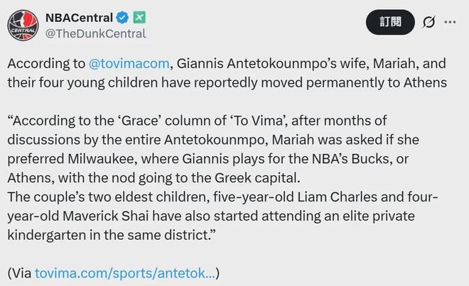 那么字母哥这些天都说了什么呢?他什么都没说,但身体很诚实。据希腊主流纸媒《To Vima》报道,经过字母哥一家数月的讨论后,字母哥的妻子玛利亚选择带着4个孩子搬离密尔沃基,回到希腊首都雅典居住,字母哥的两个大儿子——五岁的Liam-Charles和四岁的Maverick-Shai——都已经在雅典的一所精英私立幼儿园上学了。