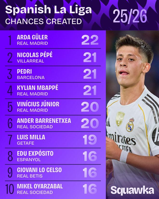 雷速体育10月7日讯 外媒统计了本赛季西甲创造进球机会次数排行榜,皇马中场居莱尔以22次居首,尼古拉斯·佩佩、佩德里以21次紧随其后。本赛季西甲创造机会排行榜:居莱尔 - 皇家马德里 - 22次尼古拉斯·佩佩 - 比利亚雷亚尔 - 21次佩德里 - 巴塞罗那 - 21次姆巴佩 - 皇家马德里 - 21次维尼修斯 - 皇家马德里 - 20次巴雷内切亚 - 皇家社会 - 20次路易斯·米拉 - 赫塔菲 - 19次埃斯波西托 - 西班牙人 - 16次洛塞尔索 - 皇家贝蒂斯 - 16次奥亚萨瓦尔 - 皇家社会 - 16次