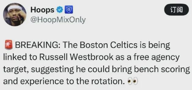 雄鹿媒体SleeperBucks更新社媒,晒出库兹马+里弗斯+威少+字母哥的合成照,并配文道:“我们是否应该考虑引进拉塞尔-威斯布鲁克?”其实雄鹿现在不缺后卫,有科尔-安东尼、特伦特、罗林斯和小波特4人足够轮换了。近日美媒Hoops爆料凯尔特人有意在自由市场签下威少,希望为球队的替补阵容补充得分火力和经验。凯尔特人倒是后场位置的人手显得捉襟见肘,如果普里查德升至首发,后卫线只有安芬尼-西蒙斯一个能打的,他又是投手承担不起组织盘活第2阵容的角色,于是引进威少的确是一个好办法。塔图姆因跟腱断裂新赛季不打,恰好能把凯尔特人的0号球衣腾出来给威少用。开个玩笑,无论如何凯尔特人的0号球衣都只属于塔图姆,而且据名记Fischer报道,这哥们很有可能明年三月份复出,他的跟腱伤病恢复速度超乎想象,甚至已经开始球场训练。严格来说,是若到了明年三月份凯尔特人有着冲击季后赛的希望,那塔图姆便可能王者归来;反之,没必要冒险,反正早在去年夏天就签下了5年3.14亿美元超级顶薪大合同无需过于拼命。不得不感叹,年轻就是好以及现在医疗技术的发达,同样是跟腱重伤,27岁的塔图姆已开始在球场上生龙活虎,35岁的利拉德也能做一些简单的投篮动作了。言归正传,今年夏天对于威少来说是极其痛苦的,拒绝执行25-26赛季价值347万美元的球员选项离开掘金之后,本以为能够很快找到新下家,现实却是始终无人问津,凯尔特人似乎成了最后一颗救命稻草,要是再把握不住退役或许就不远了。当然,36岁的威少可以选择转战海外联赛延续自己的职业生涯,可意义何在呢?又不差钱生涯薪资总薪资3.46亿美元,一旦离开NBA就他这个年龄便意味着回不来......