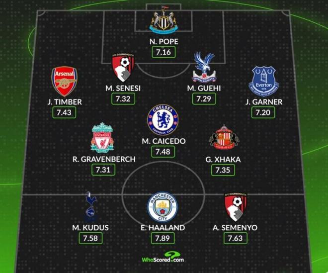 门将:波普后卫:廷伯、塞内西、格伊、加纳中场:赫拉芬贝赫、凯塞多、扎卡前锋:库杜斯、哈兰德、塞梅尼奥消息来源:WhoScored5 - 格伊也许会去到其他赛事据天空体育记者Kaveh Solhekol社媒,在免签格伊的竞争中,皇马、巴萨和拜仁比利物浦更有优势他会思考加入这些豪门的机会。