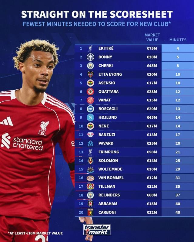 埃基蒂克夏窗以9500万欧元从法兰克福加盟利物浦,在社区盾杯的红军首秀中开场后4分钟为利物浦打入首粒进球,成为这个夏窗最快在新赛季正式比赛中进球的新援。博尼以2300万欧在这个夏天从帕尔马转会国际米兰。在国米本赛季的第一轮意甲中,博尼第68分钟替补上场,第73分钟攻入进球,帮助国米以5-0锁定赛季开门红。曼城在今年六月花费3650万欧元从里昂买来中场谢尔基,在他的首场英超中在第74分钟替补上场,8分钟后打进英超首球,帮助球队4-0战胜狼队。夏窗新援德转身价及最快攻入首球时间1.埃基蒂克 7500万欧元 4分钟2.博尼 2000万欧元 5分钟3.谢尔基 4500万欧元 8分钟4.埃永 2000万欧元 10分钟5.阿森西奥 1700万欧元 10分钟6.丹戈-瓦塔拉 2800万欧元 12分钟7.瓦纳特 1500万欧元 12分钟8.博斯卡利 2000万欧元 13分钟9.霍伊伦 4500万欧元 14分钟10.多热莱斯-内内 1700万欧元 14分钟11.班祖齐 1300万欧元 17分钟12.帕瓦尔 2000万欧元 20分钟13.弗林蓬 5000万欧元 21分钟14.所罗门 1400万欧元 25分钟15.沃尔特马德 3000万欧元 29分钟16.鲁本-范博梅尔 1200万欧元 31分钟17.马里克-蒂尔曼 3200万欧元 35分钟18.赖因德斯 6000万欧元 37分钟19.亚伯拉罕 1500万欧元 40分钟20.巴伦廷-卡尔博尼 1200万欧元 40分钟【上咪咕独家看英超】