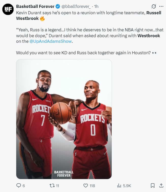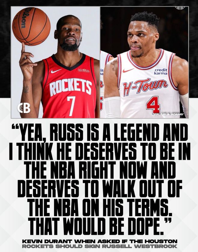 北京时间10月9日,火箭球星凯文-杜兰特在接受UpAndAdamsShow访问时谈到了关于拉塞尔-威斯布鲁克与火箭的流言情况,KD表态愿意跟威少重聚。主持人询问:我从网上听到一些声音,告诉我拉塞尔-威斯布鲁克可能加盟火箭,对吗?杜兰特说道:我不清楚,我也是听说的。通常当这种事情发生时,会声势浩大,但我在互联网之外并没有听到。威少是传奇人物,我认为他现在理应留在NBA,也应该按照自己的意愿离开联盟。所以没错,那会非常酷。但是这件事我做不了主。KD的言论至少能证明,他在互联网上听到一些消息说威少可能加盟火箭,他自己也愿意再度跟威少联手,而且杜兰特认为威少应该由自己来决定是否留在NBA打球或离开NBA,不该是这个联盟主动抛弃威少。37岁的威少难道连一份底薪都不配吗?火箭队要签下威少的难点在于火箭只剩下125万的空间,而要签下威少至少需要239万的老将底薪空间,火箭队虽然是14+3名单可由于空间不足没办法直接签下威少,必须通过交易清理空间才可以签下威少,这是难点。前NBA球星阿伦-艾弗森在一档节目中力挺威少:看到威少在场上就像看到自己,每一场比赛都拼尽全力,他的竞技状态始终如一,全力以赴贯彻到底 ,我并没有感觉他影响到了其他人。NBA名宿奥斯卡-罗伯特森在参与一档节目时也力挺威少应该继续留在NBA打球,大O表示:不明白为什么NBA没有球队想要签下威少,很遗憾联盟对他做出这样的事,如此出色的他为何被冷遇,为何要用一些莫须有的问题来责怪他呢?