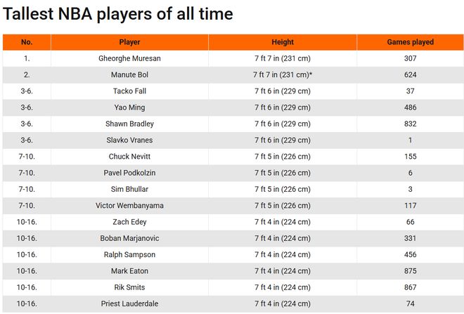 雷速体育10月9日讯 NBA官方将马刺球星文班亚马的身高更新为了7英尺5英寸(2米26),文班亚马超越2米24的扎克·埃迪,成为现役NBA最高的球员。至此,文班亚马成为NBA历史上第10位身高达到2米26及以上的球员(并列历史第7)。NBA历史上最高的球员是乔治·穆雷桑和曼努特·波尔,两人的身高都是2米31。法尔、姚明、布拉德利和弗拉内斯都是2米29,紧随其后。内维特、波德科尔金、布拉和文班亚马同为2米26,并列排名历史第7高。值得一提的是,在此前2米26及以上球员中,只有中国球员姚明的场均得分超过10分,他生涯场均可以得到19分9.2篮板1.6助攻和1.9次盖帽。其余球员中,布拉德利生涯场均81.分6.3篮板,穆雷桑场均9.8分6.4篮板,其余无人超过3分。目前文班亚马的生涯场均得分为22.5分10.8篮板3.8助攻和3.7盖帽,文班亚马极有可能成为史上最强的2米26以上巨人。