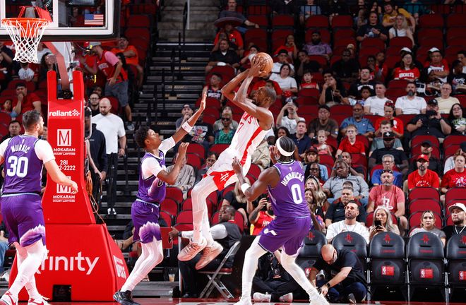 第一节火箭23-25落后2分,杜兰特开场前两次中投和一次三分出手均未命中,直到首节打到7分01秒,杜兰特借助申京的掩护,错位单挑努尔基奇时急停干拔得分,他用招牌杀招拿到加盟火箭后的第一分;第一节杜兰特出战7分多钟,4投1中拿到2分1篮板。第二节火箭凭借上半场最后阶段的一波反击攻势取得领先,单节44-36净胜8分,这一节杜兰特单挑扛着贝利打进招牌后仰中投,之后造贝利犯规并且两罚全中,杜兰特还强硬突破杀到禁区,上演不可思议的双手炸扣,如此暴扣瞬间点燃球馆。