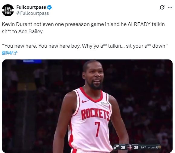 北京时间10月9日,NBA季前赛火箭对阵爵士,凯文-杜兰特正式迎来加盟火箭后的第一场比赛,首发出战23分钟27秒,10投7中轰下20分2篮板1助攻1抢断,开场3中0后连中7球,双手炸裂暴扣点燃球馆,杜兰特更是狂喷贝利从而欢迎他来到NBA。