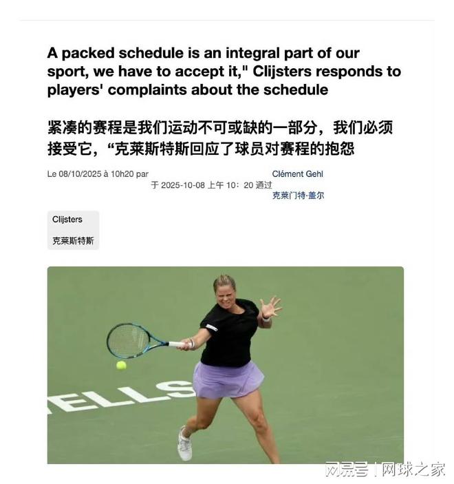 近日,比利时名将克里斯特尔斯谈到了近期很多球员热议的赛程问题,不过,在她看来,漫长赛程只是网球的一部分,球员们必须学会接受。
