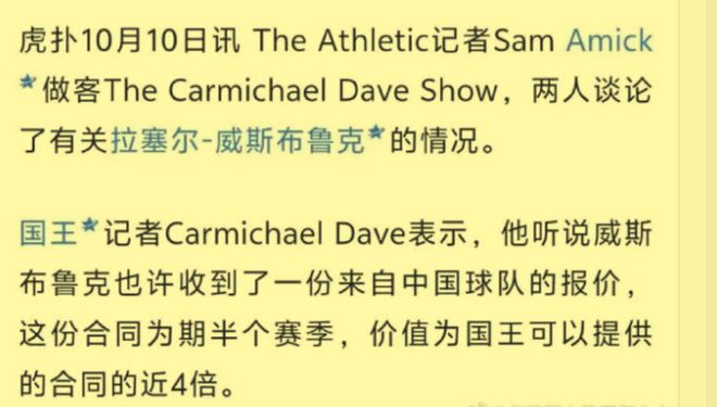 之前传出过威斯布鲁克加盟新疆队的消息,但是被辟谣了,因为威斯布鲁克是真正的NBA球星,而且上赛季在掘金队场均还可以贡献13.3分6.1助攻4.9篮板和1.4次抢断,油箱里绝对还有油。这样的球员要价都比较高,否则人家也不见得愿意大老远跑一趟。因为威斯布鲁克在NBA联赛效力这么多年也确实挣到大钱了,早已过了为生活而奔波的阶段,人家并不急着找工作。