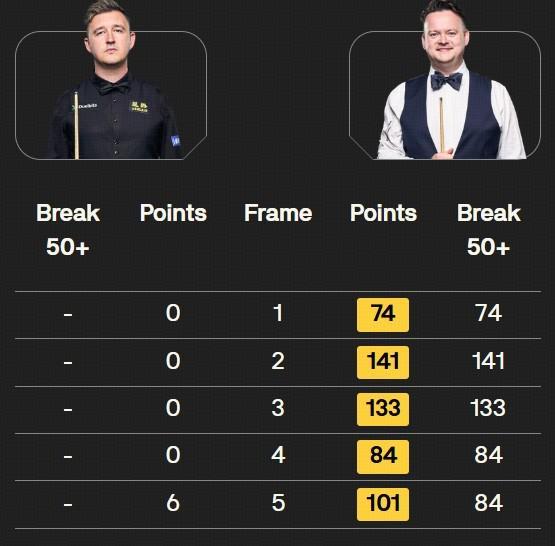 在整场比赛里,墨菲完全掌控了局势,打出了单杆74、141、133、84、84分。