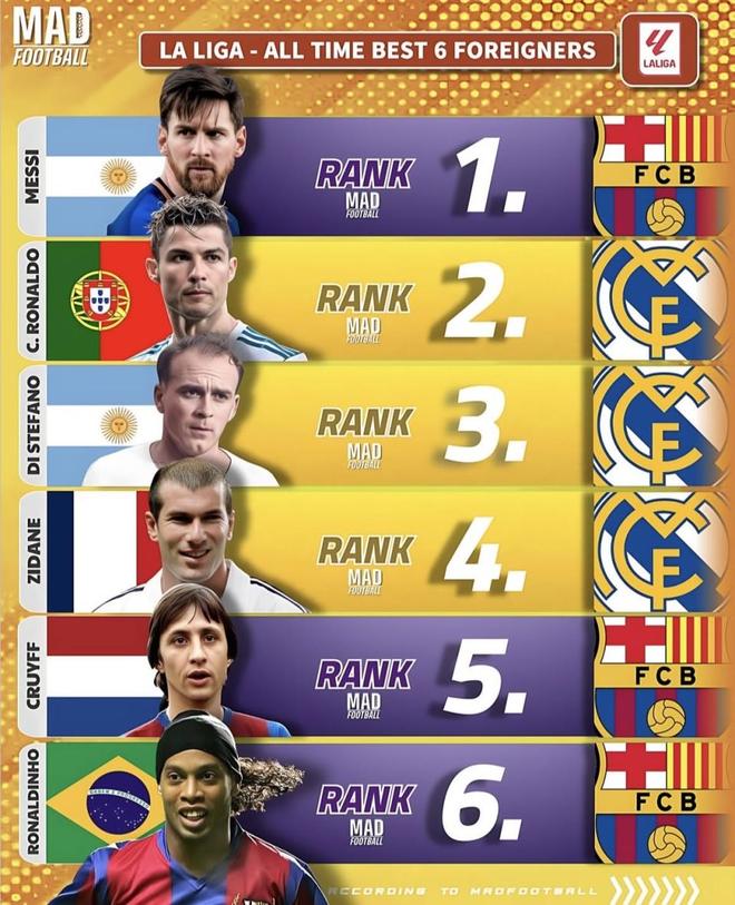 近日 MADFOOTBALL 发布“西甲历史最佳外援6人”榜单。最大争议很直接:大罗等诸多知名选手竟然没进。这份榜单到底更看“打得久”还是“巅峰强”?下面按统一口径给出入选者与遗珠的硬指标,最后再说我觉得谁该把谁换下。数据来源:MADFOOTBALL | 数据截至:北京时间 2025-09-21具体榜单梅西(Lionel Messi)国籍:阿根廷主要效力俱乐部:巴塞罗那西甲效力赛季:2004–2021西甲效力时长:17年西甲效力年龄范围:17–34岁西甲进球数:474西甲助攻数:216C罗(Cristiano Ronaldo)国籍:葡萄牙主要效力俱乐部:皇家马德里西甲效力赛季:2009–2018(2009年加盟,2018年离队)西甲效力时长:9年西甲效力年龄范围:24–33岁西甲进球数:311西甲助攻数:95迪·斯蒂法诺(Alfredo Di Stéfano)国籍:阿根廷/西班牙主要效力俱乐部:皇家马德里西甲效力赛季:1953–1966(含皇马与西班牙人)西甲效力时长:13年西甲效力年龄范围:27–40岁西甲进球数:227西甲助攻数:33齐达内(Zinedine Zidane)国籍:法国主要效力俱乐部:皇家马德里西甲效力赛季:2001–2006西甲效力时长:5年西甲效力年龄范围:29–34岁西甲进球数:37西甲助攻数:51克鲁伊夫(Johan Cruyff)国籍:荷兰主要效力俱乐部:巴塞罗那西甲效力赛季:1973–1978西甲效力时长:5年西甲效力年龄范围:26–31岁西甲进球数:47西甲助攻数:17小罗(Ronaldinho)国籍:巴西主要效力俱乐部:巴塞罗那西甲效力赛季:2003–2008 FCB Jugadors西甲效力时长:5年西甲效力年龄范围:23–28岁西甲进球数:70西甲助攻数:51谁落选可惜?1)本泽马(Karim Benzema)理由:西甲进球 238、助攻 110,随皇马拿到 4 次西甲,并在 2021-22 赛季获西甲金靴与 2022 金球奖;长期统治力+含金量兼具。2)苏亚雷斯(Luis Suárez)理由:西甲进球 176,曾单季同时拿到联赛 金靴+助攻王,并帮助马竞 2020-21 夺冠;巴萨+马竞两段都极具决定性。3)普斯卡什(Ferenc Puskás)理由:西甲进球 156(180 场),随皇马 5 次西甲,老时代顶级效率与统治力兼备,历史地位不该缺席。4)莫德里奇(Luka Modrić)理由:自 2012 年至今长期在位,拿到 4 次西甲,并获 2018 金球奖;虽非数据型,但对联赛稳定统治的“节拍器”价值极高。5)阿尔维斯(Dani Alves)理由:作为右后卫拿到 6 次西甲,长期是巴萨边路推进与压迫体系的关键;“外援后卫第一档”落选可惜。大罗落选是否可惜大罗落选=可惜,但不算最冤。巅峰强度无可挑剔:在西甲约6季就联赛进球破百,1996/97赛季为巴萨联赛34球,拿下皮奇奇+欧洲金靴,观赏性与瞬时统治力几乎无解;换成“效率”维度,他并不输亨利、C罗。劣势在“长期统治”:联赛年限短、出勤受伤病影响、联赛冠军不多。若评选更强调“年限+稳定”,他会吃亏;若看“巅峰+联赛决定性”,我会把他列进前六,优先替换数据端相对不占优的中场/前腰型入选者。