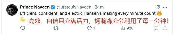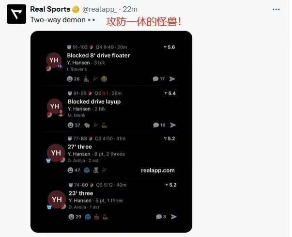 炸了!杨瀚森炸了! 今天开拓者打国王,首秀平平无奇仅得4分4板 杨瀚森毫无征兆就爆发了! 第三节比赛, 杨瀚森突然火力全开单节独取14分2板1助1帽 攻守兼备,不负众望,杨眉吐气,未来可期 当杨瀚森投中NBA生涯第一个3分的时候 球迷还以为这只是一个简单普通的3分球 万万没想到杨瀚森,真特么给我们争气啊 不飞则已,一飞冲天;不鸣则已,一鸣惊人 弧顶三分手起刀落,连续两个3分 剑指苍穹天地阔,少年壮志任翱翔 内线轻挑连得8分, 杨瀚森疯狂得分秀 纵无鲲鹏扶摇力,亦借长风击沧溟 单挑尤班克斯,背运旋转上篮,约基奇附体连拿10分 少年自有凌云志,不负黄河万古流 白马长枪飘如诗,鲜衣怒马少年时 他的中投没有酒,我却看得如痴如醉 两个罚球,连得14分 第三节最后时刻,一夫当关,万夫莫开,只手遮天压哨封盖蒙克 无人扶我青云志,我自踏雪至山巅 还有这样的击地妙传雪没昆仑孤鸿迹,云巅自刻我名姓 第三节,杨瀚森弹无虚发,5投5中,3分2中2,罚球2中2,一个人连得14分。我只想问一句,杨瀚森在CBA有过这么疯狂的单节秀吗?3分,突破,中投,罚球,助攻,盖帽,这不就是巅峰约基奇吗?神迹啊!神迹啊!真的看爽了,看哭了!好久没有看球这么激情,这么热泪盈眶了中国人在NBA赛场吐气扬眉,这是多么久远的历史了全场比赛,杨瀚森出战17分钟,投篮8中5,三分3中2,罚球4中4,砍下全队第三高的16分4篮板1助攻3盖帽,正负值+9。得分和盖帽也刷新了杨瀚森的个人纪录。17分钟16分4板1助3帽,攻防一体,效率机器,大吹特吹,没人反对吧?NBA官方推特也晒出了杨瀚森的数据:16分4篮板3封盖!杨瀚森一战打服了美国网友看看没见过世面的美国球迷的彩虹屁,他们还是太年轻了,没看过姚明吧? 赛后,比卢普斯大大表扬了杨瀚森:“我太为他骄傲了,他在训练营也偶尔会有高光,但今天这样的表现实在是太棒了…我知道他可以,他一直希望我们满意,他一直很努力。 ”谢谢比卢普斯无条件信任杨瀚森,终于迎来了今天的爆发这也是比卢普斯历史地位在中国球迷心中狂飙的一天「他才是真正的历史第一控卫(对不起了库里)」「世界名帅~比卢普斯」「超级高水平」杨瀚森今天真的可能吹上天不过实事求是,杨瀚森还只是小火龙,微微喷火赢得球迷信任有一说一,杨瀚森能成为杨基奇吗? 前天「杨瀚森打不了NBA」 我不希望今天有人会说 「NBA季前赛而已」 也不希望未来会有 「常规赛摆烂队的数据有什么好吹的 」 「 季后赛也就一轮游的水平 」 「 总决赛成了别人的背景板 」 杨瀚森,今天,牛逼炸了,新赛季,看球的热情炸了! 波特兰的天亮了! 太激动了,差点忘了说比分 开拓者124-123国王 杨瀚森是今天的MVP!