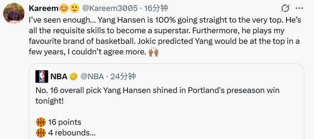 雷速体育10月11日讯 NBA季前赛继续进行,开拓者在主场124-123险胜国王,拿到季前赛主场开门红。本场比赛,杨瀚森出战了17分钟,投篮8中5,三分球3中2,罚球4中4,得到16分4篮板1助攻3盖帽。美国球迷转发NBA官方发布的杨瀚森集锦,评价杨瀚森:“我已经看够了(他的表现)……杨瀚森百分之百会直奔顶峰。他具备成为超级巨星所需的一切必要技能。此外,他打的篮球正是我最喜欢的那种风格。约基奇预测杨瀚森几年内就会达到顶尖水平,我完全赞同。” 值得一提的是,还有波特兰当地球迷为杨瀚森创建了“Yang Hansen Muse”球迷账号。