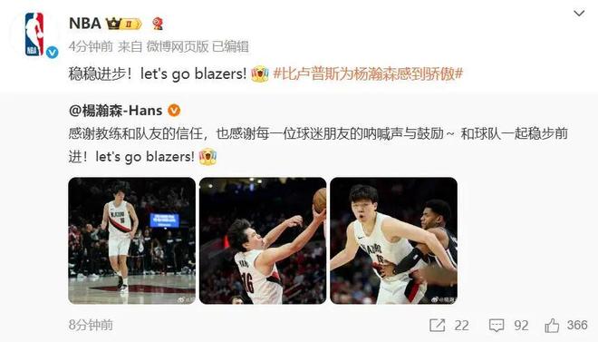 今天淄博小伙杨瀚森迎来NBA季前赛主场首秀杨瀚森相关多个话题冲上热搜。杨瀚森出战17分钟,投篮8中5、罚球4中4砍下16分4篮板1助攻3盖帽。其中第三节投篮5中5,罚球2中2砍下14分2篮板1助攻1盖帽。最终,开拓者124-123战胜国王。北京时间10月11日,开拓者队迎来第二场NBA季前赛,主场以124:123险胜国王队。中国球员杨瀚森发挥出色,出场17分08秒,全场贡献16分4篮板1助攻3盖帽,其中第三节5投5中,单节砍下14分。11日下午,杨瀚森在社媒发文:感谢教练和队友的信任,也感谢每一位球迷朋友的呐喊声与鼓励~ 和球队一起稳步前进!let's go blazers!NBA官方随后转发杨瀚森博文:稳稳进步!let's go blazers!网友评论:北京时间10月9日,开拓者队客场123:129不敌金州勇士队。杨瀚森迎来职业生涯NBA季前赛首秀,他替补登场贡献4分4篮板1助攻,最后时刻犯满离场。今天回到主场,杨瀚森的状态明显回升。对阵国王队的上半场,杨瀚森出场机会不多只得到2分,但第三节他突然爆发,连续命中两个三分球,单节得到14分。赛后,开拓者主帅比卢普斯点评杨瀚森的表现:“他今天打得很好,找到了自己的节奏,并且也有一些惊艳表现,他有很棒的护筐能力,防守站位方面也有进步。在上一场比赛后,我们都知道他想触底反弹、并且也都想看到他反弹,而他也确实做到了,这让我们感到欣慰,因为他真的全情投入了,我十分为他骄傲。”10月15日,开拓者将再战勇士,期待杨瀚森更多精彩表现。监制:武莉编辑:史静责编:刘晓琳来源 : 红星新闻、 @NBA、央视新闻、青岛日报
