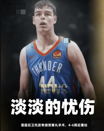 加上ACL撕裂赛季报销的新秀索伯,还有只打一场又手术的托皮奇,雷霆已经出现了4名伤员。坏消息:雷霆还没开打,就已经伤了4人好消息:雷霆家底真厚,常规赛影响不大值得一提的是二年级新秀托皮奇,上赛季报销的他,今年季前赛只打了一场,表现还不错的样子,9中4得到10分4板7助攻,然后又手术去了。美记者爆料,雷霆后卫托皮奇接受了睾丸手术,大约4-6周后重新评估。蛋蛋的忧伤。这手术听起来就很蛋疼,不过在NBA也不是第一个。马努、八村垒和德特勒夫-施伦普夫都曾因睾丸受伤(蛋疼)而伤缺一段时间,平均缺阵时间在40天。