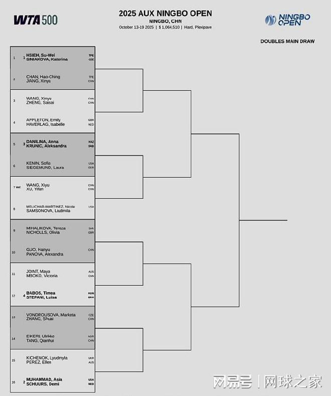 双打签表:蒋欣玗/詹皓晴 vs谢淑薇/西尼亚科娃、王欣瑜/郑赛赛 vs 阿普尔顿/哈弗拉格、王曦雨/徐一璠 vs 梅里查尔/萨姆索诺娃、郭涵煜/帕诺娃 vs 米哈利科娃/尼科尔斯、张帅/万卓索娃 vs 汤千慧/艾克里。祝金花们好运!
