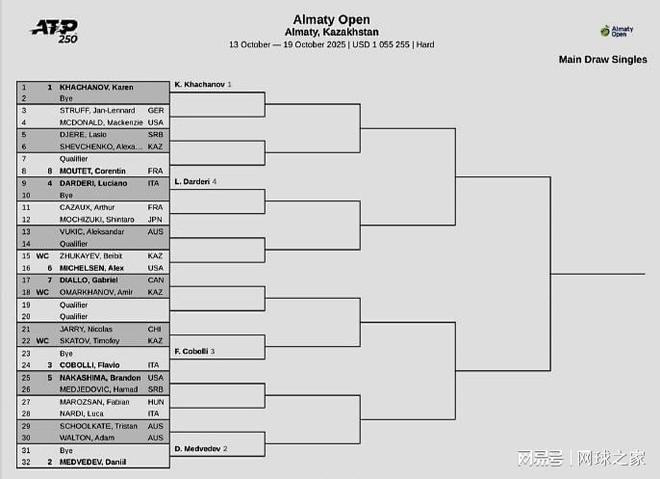我们再来关注下周赛事。北京时间昨晚,ATP250阿拉木图站公布了单打正赛签表。俄罗斯双雄卡恰诺夫、梅德维德夫、意大利人科博利、达尔德里作为前四种子出战,中国球员无人参赛。