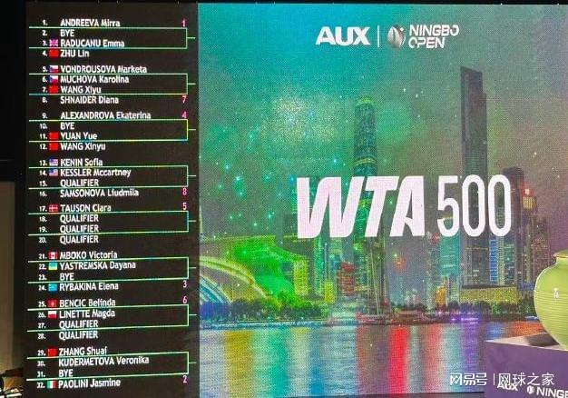 同期开打的WTA500宁波网球公开赛也官宣了正赛签表。俄罗斯新星米拉-安德列娃、意大利小钢炮鲍里妮、哈萨克斯坦名将莱巴金娜和俄罗斯人亚历山德洛娃位列单打前四号种子。中国球员首轮对阵:朱琳vs拉杜卡努、王曦雨vs施耐德、袁悦vs王欣瑜、张帅vs库德梅托娃。
