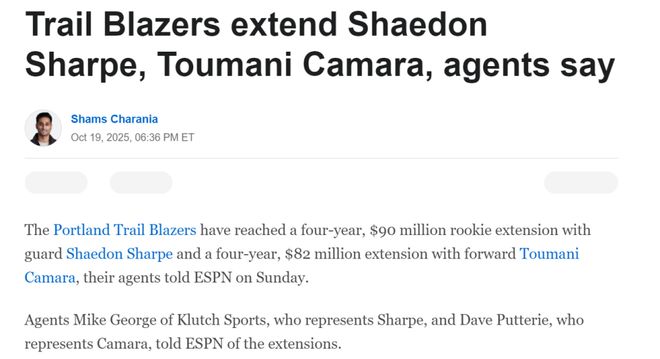开拓者豪掷1.72亿续约两名核心球员,杨瀚森一口气喜迎3大利好!青岛主帅刘维伟被曝受邀现场观看爱徒杨瀚森NBA首秀。开拓者豪掷1.72亿续约在常规赛即将开打之际,开拓者队豪掷1.72亿美元接连与夏普、卡马拉两名新星完成续约。根据ESPN名记Shams报道,开拓者队与谢顿-夏普签下一份四年价值9000万美元的提前续约合同。作为22年的7号秀,夏普合同还剩最后一年价值840万美元。上个赛季场均拿下18.5分4.5篮板2.8助攻0.9抢断,是开拓者队后场最重要的发动机与培养目标之一。季前赛夏普也展现出长足的进步,新赛季有望在数据产量与效率两方面迎来全面提升。不久后Shams跟进曝出,开拓者队又与卡马拉达成4年价值8200万美元的提前续约合同。相比于依赖进攻的夏普,卡马拉则凭借防守成为开拓者队未来基石之一,上个赛季制造对手91次进攻犯规联盟第一,也是NBA设置该项数据统计以来的历史第二高表现。其中包括31次带球撞人犯规,同样高居联盟第一,凭借这样的表现,卡马拉成功入选最佳防守二阵,是开拓者03-04赛季以来首位入选最佳防守阵容的球员。加上在进攻端投出38%的三分命中率,卡马拉甚至比夏普有着更加光明的未来,并且他只是23年的52号秀,交出这样的表现,拿下一份千万级别大合同堪称励志。而开拓者队一天时间内豪掷1.72亿美元续约两名新星对于杨瀚森也是利好,后者一口气迎来3大利好。第一大利好:更加稳定的阵容过去几个赛季开拓者队都处于无序的摆烂重建之中,随着豪掷1.72亿续约两大新星,开拓者队正在敲定未来3年的建队核心阵容。目前开拓者大名单中共有8名球员手握至少3年合同:利拉德、格兰特、夏普、卡马拉、阿夫迪亚、霍勒迪、克林根、杨瀚森。稳定的人员名单意味着稳定的化学反应与队内环境,对于年轻杨瀚森的成长无疑是巨大的利好。值得一提的是,刚刚与开拓者队完成大额续约的两名球员夏普与卡马拉均为里奇保罗旗下球员。另外开拓者队主帅比卢普斯同样如此,而杨瀚森也隶属于保罗里奇旗下,这样的潜在关系显然有利于杨瀚森在NBA的发展。第二大利好:刘维伟受邀观看首秀根据山东媒体报道,青岛男篮主教练刘维伟受到邀请,将在现场见证弟子杨瀚森的NBA首秀。无论这一邀请来自于NBA官方,还是开拓者队,都能说明杨瀚森在队内与联盟受到的重视与关注。第三大利好:认可与期待在常规赛即将开打之际,开拓者队记Sean Highkin在播客节目中谈及杨瀚森季前赛最后一场6犯离场落泪时,主动为这名年轻人辩解。队记Sean Highkin直言自己完全理解杨瀚森的心态,他只是一名年仅20岁的年轻人,自从进入NBA以来,太多的东西需要他来应对,而他甚至连语言还不太能掌控。要知道他的祖国有8亿人关注着他的动态,这是一种无形的巨大压力,因此流泪只能说明他渴望变得更好,并且对此非常在意。NBA官方更是直接晒出杨瀚森季前赛表现,场均出战18.4分钟,可以得到8分3.5板1助攻1.3帽。并且配文称赞道:“杨瀚森季前赛表现抢眼!”可见无论是开拓者内部,还是NBA官方,对于杨瀚森季前赛的表现都是认可与称赞,并且十分期待他在新赛季常规赛的表现。