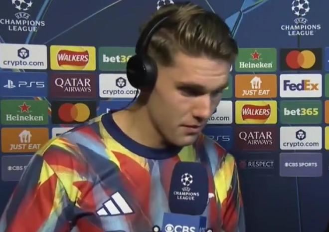 在主场4-0战胜马竞的赛后,本场比赛打进两粒进球的阿森纳前锋哲凯赖什接受了CBS sports的采访。欢迎来到节目,维克托!先和观众们打个招呼吧。大家好!今天太出色了,梅开二度帮助球队取胜,感觉怎么样?这可是你加盟阿森纳后的欧冠首球,还是两个!感觉太棒了。我们整场比赛都踢得很好,能为阿森纳打进欧冠首球,而且一进就是两个,真的太不可思议了。之前你一直很努力,为球队战术体系拉扯空间、给队友创造内切机会,但始终没能收获进球,那段时间会不会很沮丧?当然,作为球员肯定想为球队做贡献,但前锋的职责就是进球,没能破门的时候确实会沮丧。不过我知道必须坚持下去,相信进球总会来的——今天终于等到了。加盟阿森纳后,要适应新战术和英超强度,这个过程顺利吗?你之前也在英格兰踢过球,但这次是更高水平的挑战。肯定需要适应期,要熟悉队友、理解战术打法和球队的比赛风格,和之前的环境确实不一样。适应需要时间,但现在一切都在往好的方向发展,从比赛表现也能看出来,感觉很棒。阿森纳的定位球战术太出色了,你们平时会花很多时间训练吗?这简直是球队的秘密武器。我们确实会专门训练定位球,但具体的战术细节就不方便透露了。关键是我们不仅练得多,还带着强烈的求胜欲去执行,所以效果才好。首先恭喜你进球和球队获胜!想问问你个人和阿森纳本赛季的目标是什么?联赛和欧冠双线争冠会不会太贪心?首先,我们的首要目标肯定是赢得冠军,这是全队的愿望,也是最重要的。对我个人来说,除了进球,还要不断提升自己的球技。至于联赛和欧冠双线争冠,我觉得完全可以尝试,这对我们来说是合理的目标。维克托,你穿的14号球衣意义非凡,阿森纳的14号可是传奇号码(亨利曾身披此号码)。穿上这件球衣会不会感到压力?毕竟大家会期待你像前辈一样成为进球核心、带领球队夺冠。说实话,能穿上这件球衣很荣幸。我知道这件球衣承载着很多进球荣耀,现在我要做的就是延续这份荣耀,打进更多球。这种期待对我来说是动力,感觉很棒。你没带件球衣来节目吗?能送我一件吗?(笑)这个得问俱乐部才行,不过没问题,之后可以给你安排。是你自己选择14号的吗?是不是想主动承担这份责任,继承亨利的衣钵?其实当时可选的号码不多,但看到14号有空缺时,我立刻就想拿下它——能穿上这个号码是巨大的荣誉。可惜没能提前问问亨利前辈的意见,但能穿上它,我真的很自豪。亨利:维克托,14号不是我的专属,只是我曾用过而已。现在它属于你了,希望你好好对待它,多进球——这就是我们最需要的。如果你想要我其他号码,之后可以在社媒上跟我说。【上咪咕独家看英超】