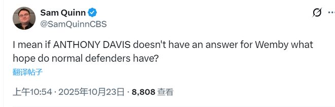 面对独行侠双塔,文班亚马予取予求,他无视浓眉哥,空切暴扣。他运球单挑浓眉哥,直接左手劈扣浓眉。文班亚马在10月23日的揭幕战火力全开,打出了本赛季联盟最闪耀的揭幕战表现。他在这一战出战30分钟,21投15中,三分球2中1,罚球11中9,轰下40分15篮板1助攻1抢断3盖帽,全场0失误,正负值达到了+31。