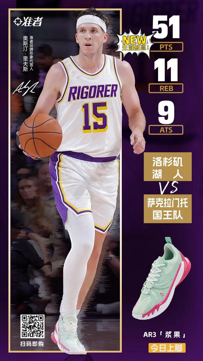 里夫斯全场22中12,三分9中5罚球球22中21砍下51分11篮板9助攻2抢断