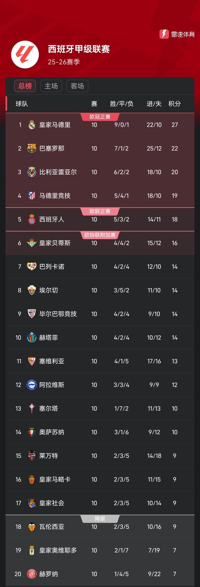 雷速体育10月28日讯 今天凌晨,西甲第10轮最后一场比赛,马竞客场2-0战胜皇家贝蒂斯。在最新积分榜上,赢下国家德比的皇马领衔巴萨5分,继续领跑;比利亚雷亚尔20分排名第三,马竞19分排名第四,西班牙人第五,贝蒂斯第六。赫罗纳和奥维耶多同积7分,排名倒数前两位。瓦伦西亚、皇家社会、马略卡、莱万特同积9分。西甲第10轮赛果皇家社会2-1塞维利亚赫罗纳3-3奥维耶多西班牙人1-0埃尔切毕尔巴鄂竞技0-1赫塔菲瓦伦西亚0-2比利亚雷亚尔马略卡1-1莱万特皇马2-1巴萨奥萨苏纳2-3塞尔塔巴列卡诺1-0阿拉维斯贝蒂斯0-2马竞相关资讯