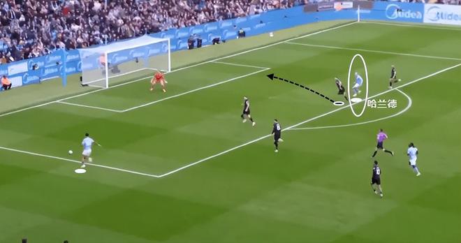 从下图可以看到,当曼城在边路获得机会后,埃弗顿后卫是高速回撤想要保护禁区后点。这个思路是因为以前的哈兰德,一定是扑球门后点等队友把球传过来。因为当时的哈兰德不擅长头球,他的进攻手段就相对单一,对方明确了目标就会提前预判。不过在哈兰德头球进步之后,他的选择是停顿下来,看着后卫跑向小禁区,随后做好了起跳的准备。