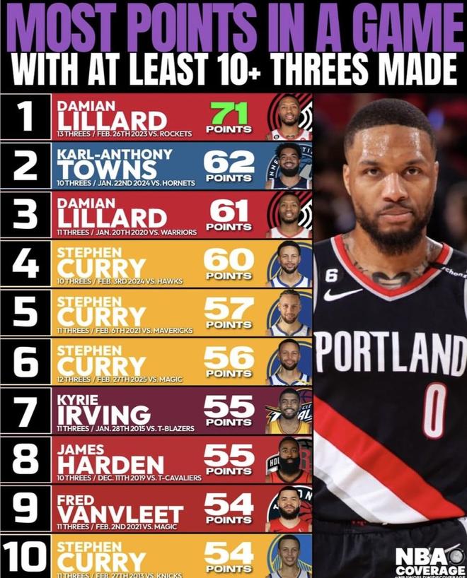 利拉德(Damian Lillard)国籍:美国三分命中:11日期:2020年1月20日对手:勇士最终比分:129–124(胜)当时年龄:29岁得分:61分库里(Stephen Curry)国籍:美国三分命中:10日期:2024年2月3日对手:老鹰最终比分:134–141(负)当时年龄:35岁得分:60分