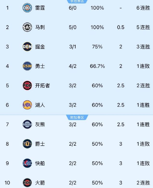 对了,看尼古拉-托皮奇这个名字,就知道是塞尔维亚人,希望他不仅能够早日重返赛场还可以尽早打出来,如此一来约基奇的国家队征程又有新帮手,从而共同完成站上世界之巅的目标。 简单谈谈雷霆的情况,目前为止以6胜0负高居西部&联盟榜首位置,他们在防守效率值上以103.6傲视群雄,马刺则以104.8紧随其后。马刺本赛季真的是崛起了,同样至今未尝败绩(5胜0负),且净效率值以+15.6遥遥领先所有球队。