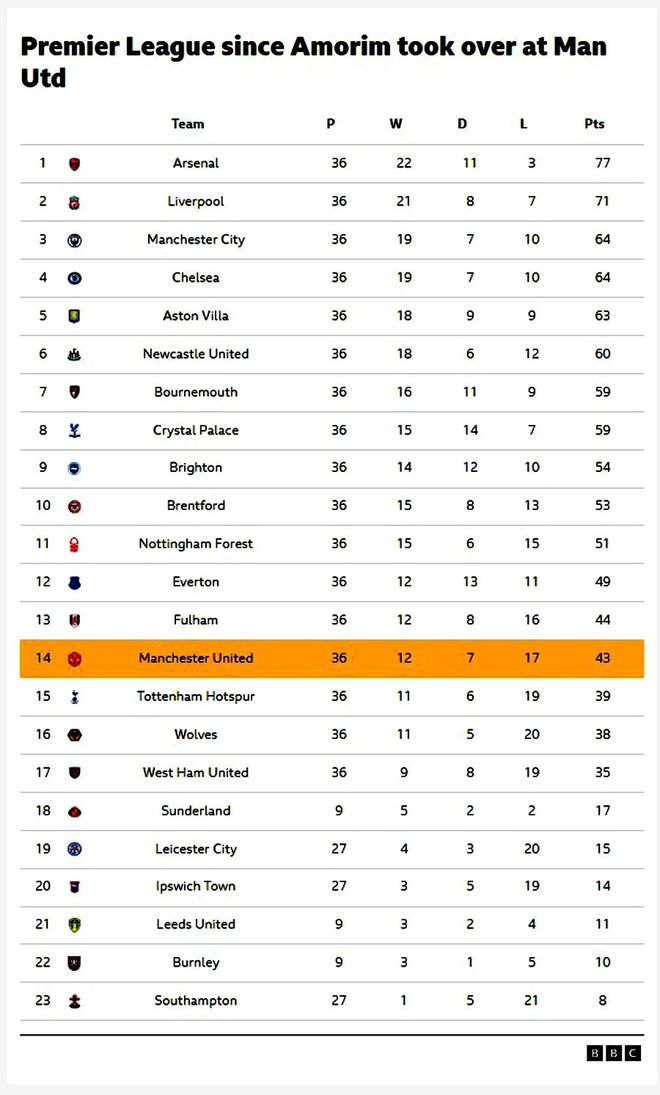 对于自己的343阵型是否已经证明有效,阿莫林表示:「我很清楚自己想怎么踢。也许我的方法需要更长的时间,才能让别人真正理解。但我所做的,是我认为对球队和俱乐部最有利的事情!」在曼联的一年之间,阿莫林输掉了52场比赛中的19场,他在场边有时候显得颇为消极,颓然地蹲着,或者仰头望天。