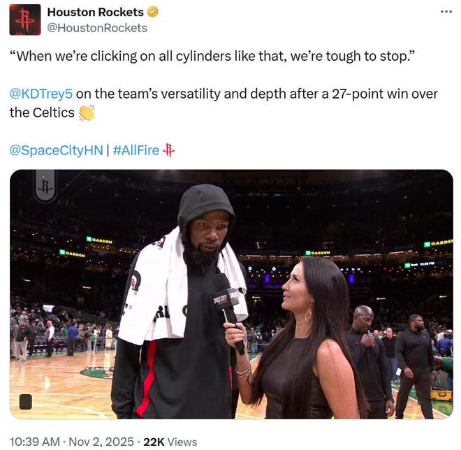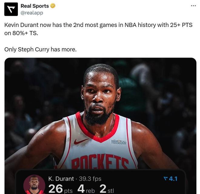 处于合同年的伊森更是不必多说,本场延续夸张的三分投射表现,三分6中4拿下12分,开季至今伊森在场均出手4.2次三分的情况下,投出了57.1%的夸张命中率。一众新星的成长,以及杜兰特的加盟,让火箭队一改往日在进攻端的挣扎,开季至今场均轰下127.8联盟第一,真实效率53.7%联盟第二,净效率+13.3联盟第二。即便数据样本相对较小,但不得不承认杜兰特加盟后,重拾快速反击与篮板优势的火箭队在进攻端迎来蜕变式成长。