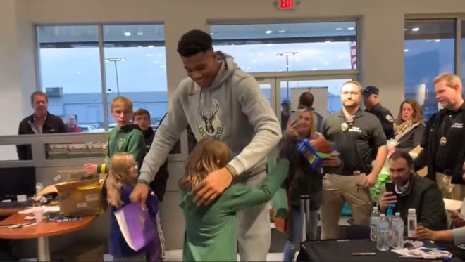 在雄鹿的一场签名会现场,一个小女孩将球衣递给了字母哥,随后将自己亲手画的画册送给了自己的偶像,字母哥也是立马起身拥抱了小女孩,还一页一页的看了小女孩的画册。看到小女孩激动落泪后,字母哥也是赶紧去安抚女孩的心情,还与小女孩一起合影留念。
