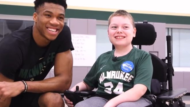 在看到患病小男孩最大的梦想是跟NBA球员互动时。雄鹿官方邀请了小男孩到雄鹿训练馆,字母哥也是为小男孩送上了自己的签名球衣,随后还召集了队友们聚在一起让小男孩喊口号。在合影留念环节,字母哥更是毫无球星架子,因为身高原因,他直接单膝跪在地上和小男孩留影。