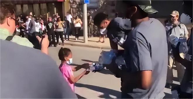 除了现场喊话表示支持之外,字母哥还跟队友们一起穿上了“我不能呼吸”的T恤,同时买了很多物资。字母哥更是亲自弯腰给这些参与者发放矿泉水。