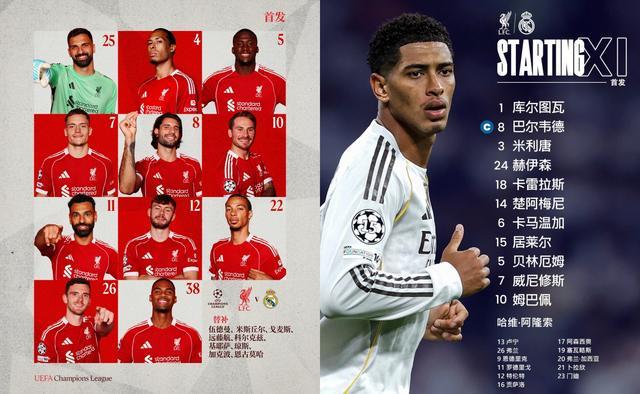 利物浦 1-0 皇家马德里进入11月,利物浦此前在英超2-0击败维拉,结束10月各项赛事6场仅1胜的尴尬,斯洛特派上埃基蒂克单箭头,萨拉赫、索博斯洛伊和维尔茨紧随其后。皇马近期状态不俗,领跑西甲的同时各项赛事6连胜,阿隆索安排姆巴佩突前,维尼修斯、贝林厄姆、居莱尔、卡马文加等人上阵。
