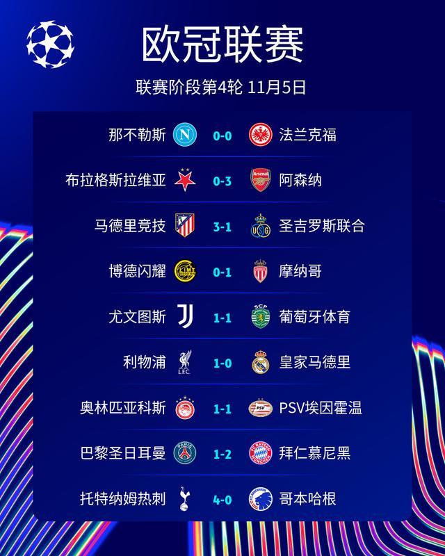 至此,11月5日的欧冠联赛阶段第4轮的9场比赛战罢,结果分别为:那不勒斯0-0法兰克福、布拉格斯拉维亚0-3阿森纳、马德里竞技3-1圣吉罗斯联合、博德闪耀0-1摩纳哥、尤文图斯1-1葡萄牙体育、利物浦1-0皇家马德里、奥林匹亚科斯1-1PSV埃因霍温、巴黎圣日耳曼1-2拜仁慕尼黑、托特纳姆热刺4-0哥本哈根!对于今天的欧冠比赛,球迷们有何看法呢?