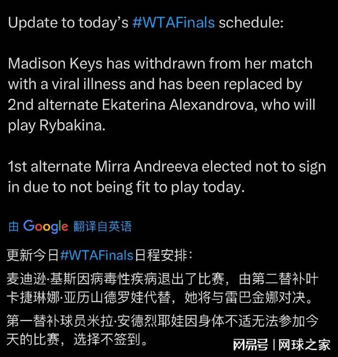 没有意外,小组赛两连败的凯斯在今天赛前宣布因病毒性疾病退赛。这一突发状况本应给予第一替补安德列娃晋级机会,然而这位俄罗斯新星因身体状况不佳,决定放弃替补上场资格。