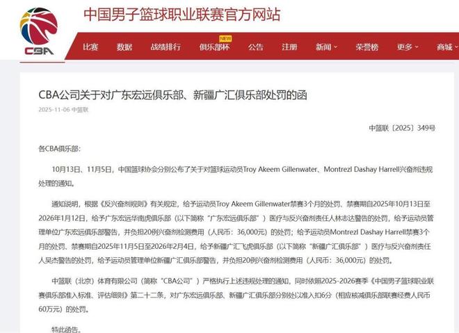 广东宏远队上赛季外援吉伦沃特同样因为兴奋剂违规的问题被处罚,处罚结果和新疆队一致,同样是球员禁赛3个月,队医林志达被警告,球队需承担20例兴奋剂检测费用36000元。另外,新疆队和广东队还分别被扣CBA准入分6分,相应核减俱乐部联赛经费60万元,也就是两支球队各被CBA联赛和篮协处罚63.6万元。更重要的是扣除联赛准入分6分,每支球队在新赛季开始前都有12分(类似于驾驶证),不同的违规行为有不同的扣分项或者罚款,12分被全部扣除完后球队将失去本赛季的比赛资格,这是非常严格的。