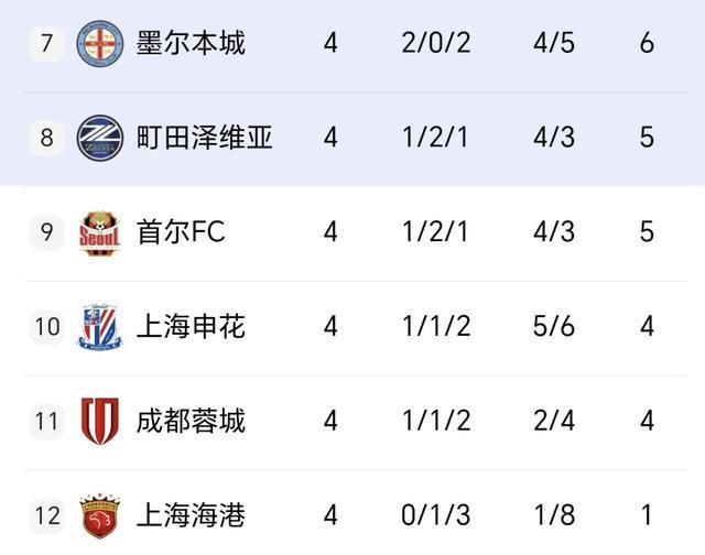 11月5日,本赛季亚冠精英联赛第4轮战罢,积分榜更新后,中超前三球队相当亮眼,成功包揽了东亚区倒数前三!目前中超第2的上海申花,4轮1胜1平2负,积4分位列第10。中超第3的成都蓉城,同样是4轮1胜1平2负,积4分排在第11。当前高居中超榜首的上海海港,4轮0胜1平3负,仅积1分第12垫底!11月6日,北京国安主场3-0击败香港球队大埔,终于在亚冠二级联赛取得首胜,4轮1胜2平1负积5分E组第3,身前是澳大利亚球队麦克阿瑟FC和越南球队河内公安。