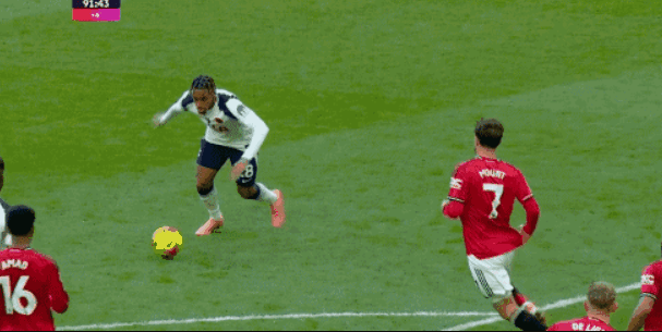 第62分钟热刺中场抢断后,第一时间推反击,约翰逊虽然单刀破门,但越位在先导致进球被取消,狂攻不止的热刺,终于在第84分钟扳平比分,替补登场的特尔,禁区内转身抽射让拉门斯无可奈何,将比分追至1平,起势的热刺在伤停补时第91分钟反超比分,奥多贝尔大禁区外开炮,理查利森头球一蹭,将比分改写为了2-1,但曼联也没有放弃,德利赫特最后时刻的绝平进球,将比分定格为了2-2。