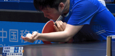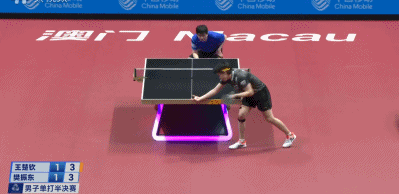 但是王楚钦在发球环节给樊振东极大压力——1比3,王楚钦发了一个台角保护的半出台,樊振东一吊,被早等在位置的王楚钦一个倒地爆冲。