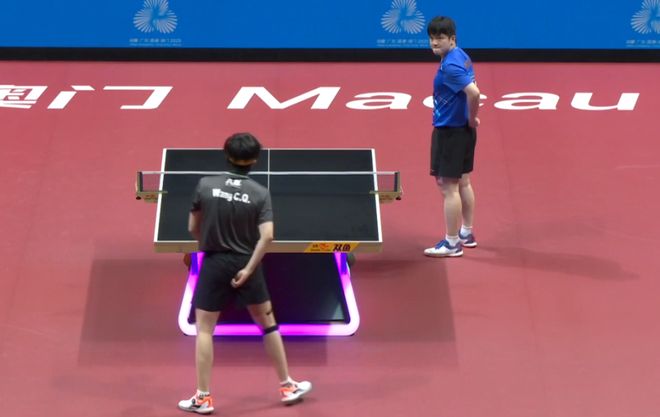 后面被王楚钦连续两个倒地爆冲(上台一个被防回去一个)之后,樊振东变了一个长球,又被王楚钦直接侧身得分。