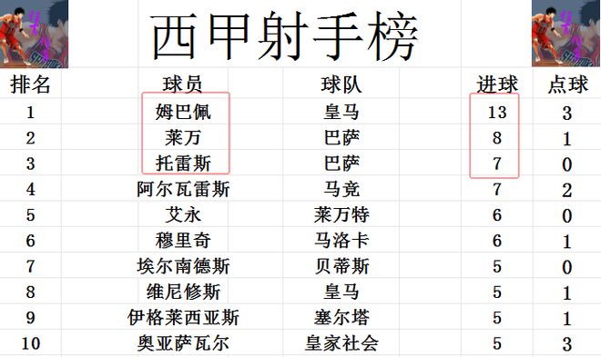 射手榜方面,姆巴佩今天未能继续进球,还是13球位列榜首。前十其他位置也没有变化,莱万8球第2,托雷斯,阿尔瓦雷斯7球并列第3,爱用和穆里奇6球并列第5。维尼修斯替补登场未能进球,还是和伊格莱西亚斯,奥亚萨瓦尔等人5球挤入前十。相关资讯