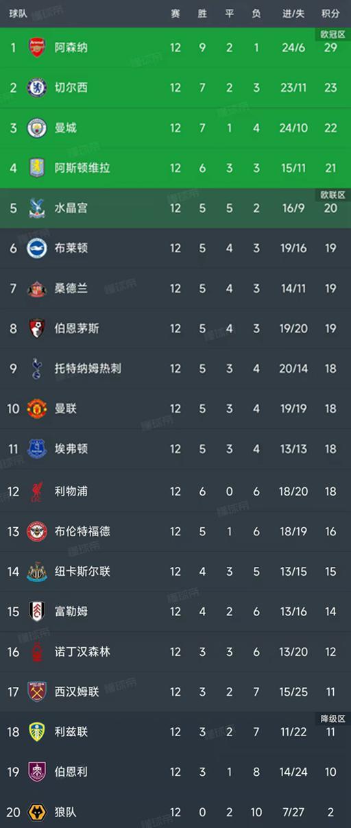枪手稳居第一目前紧追枪手的是切尔西,后者2-0战胜了伯恩利,目前的积分是23分。曼城本轮1-2不敌纽卡斯尔联,遭遇赛季第4场败仗,已经落后了枪手7分,陷入了被动。阿斯顿维拉以21分暂列第4名,他们只领先身后的水晶宫1分,欧冠门票并不保险。布莱顿、桑德兰和伯恩茅斯的积分都是19分暂列第6-第8名。排在倒数后三名的球队分别是利兹联、伯恩利和狼队!相关资讯