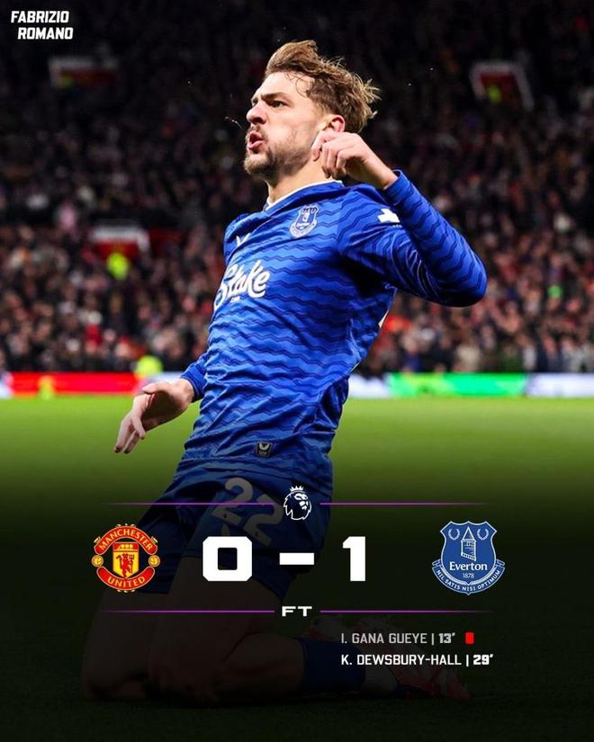 整场比赛,曼联射门23次射正6次却0进球,而埃弗顿只有3次射门,1次射正便取得制胜进球。埃弗顿也成为英超史上首支,十人作战依然能在客场掀翻曼联的球队。这也是曼联时隔12年,再度在英超主场输给埃弗顿。