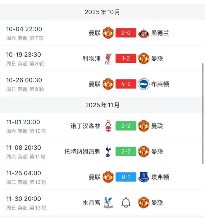 0比1不敌埃弗顿,这是曼联历史首次在主场人数占优的情况下输掉联赛。此前46次出现这样的情况,曼联36胜10平。当赛后被问及如何总结这场比赛时,曼联主帅阿莫林回答说:“沮丧,失望”“比赛进行了不到20分钟,对方球员被红牌罚下。无论如何,我们都应该赢下这场比赛。”甚至看到盖耶与基恩的冲突,阿莫林都有一些羡慕,他希望自己的球队也能有这样对胜利的渴望:打架并不是坏事,这说明他们想赢球。阿莫林与曼联在10月有多辉煌(3战全胜),11月就有多黯淡(3场不胜)。