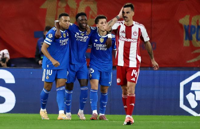 作为希腊第一豪门,奥林匹亚科斯前4轮成绩还未拿到一场胜利。这场比赛阿隆索将阵型改为了3后卫,楚阿梅尼回撤与劳尔-阿森西奥、阿尔瓦罗-卡雷拉斯搭档防线;门迪、阿诺德分居两翼;巴尔韦德、卡马文加、居莱尔搭档中场;双前锋的维尼修斯与姆巴佩;卢宁顶替生病的库尔图瓦迎来赛季首秀。