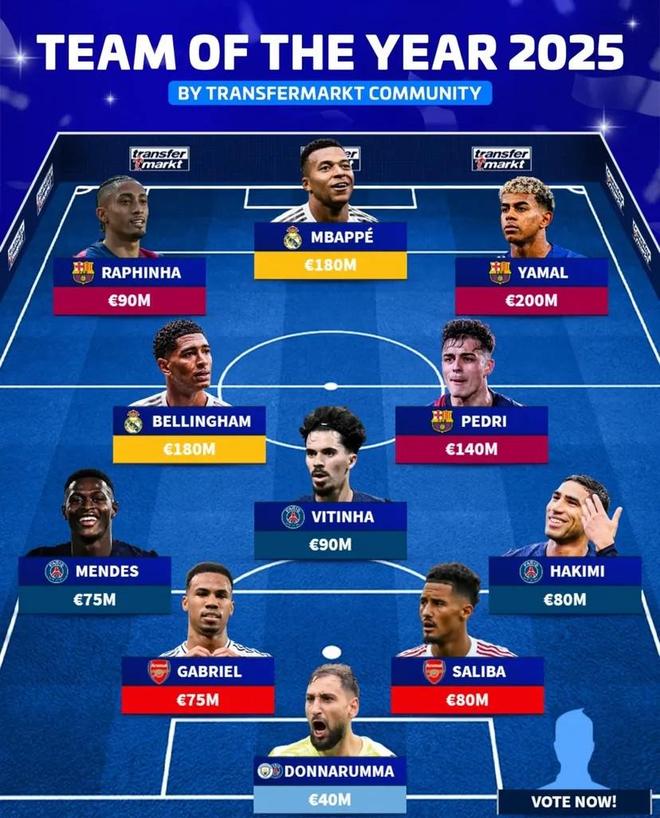 德转评2025年最佳阵容:门将多纳鲁马(曼城/巴黎圣日耳曼)4000万欧元后卫阿什拉夫(巴黎圣日耳曼)8000万欧元、萨利巴(阿森纳)8000万欧元、加布里埃尔(阿森纳)7500万欧元、努诺-门德斯(巴黎圣日耳曼)7500万欧元中场佩德里(巴塞罗那)1.4亿欧元、维蒂尼亚(巴黎圣日耳曼)9000万欧元、贝林厄姆(皇家马德里)1.8亿欧元前锋亚马尔(巴塞罗那)2亿欧元、姆巴佩(皇家马德里)1.8亿欧元、拉菲尼亚(巴塞罗那)9000万欧元【上咪咕独家看英超】相关资讯
