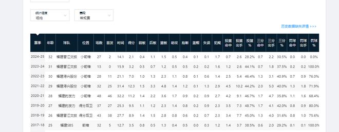 CBA24-25赛季,黄毅超场均仅能为球队贡献2.1分1.5篮板,投篮命中率低至28.2%。23-24赛季,他场均数据仅为3.2分1.2篮板0.5助攻。