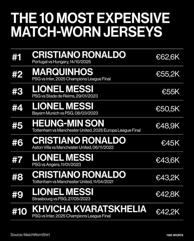 第1名C罗(Cristiano Ronaldo)国籍:葡萄牙比赛双方:葡萄牙 vs 匈牙利比赛时间:2025年10月14日(世预赛欧洲区小组赛)比赛结果:葡萄牙2-2匈牙利(平局)球衣价格:62.6万欧元(约合人民币:513万元)